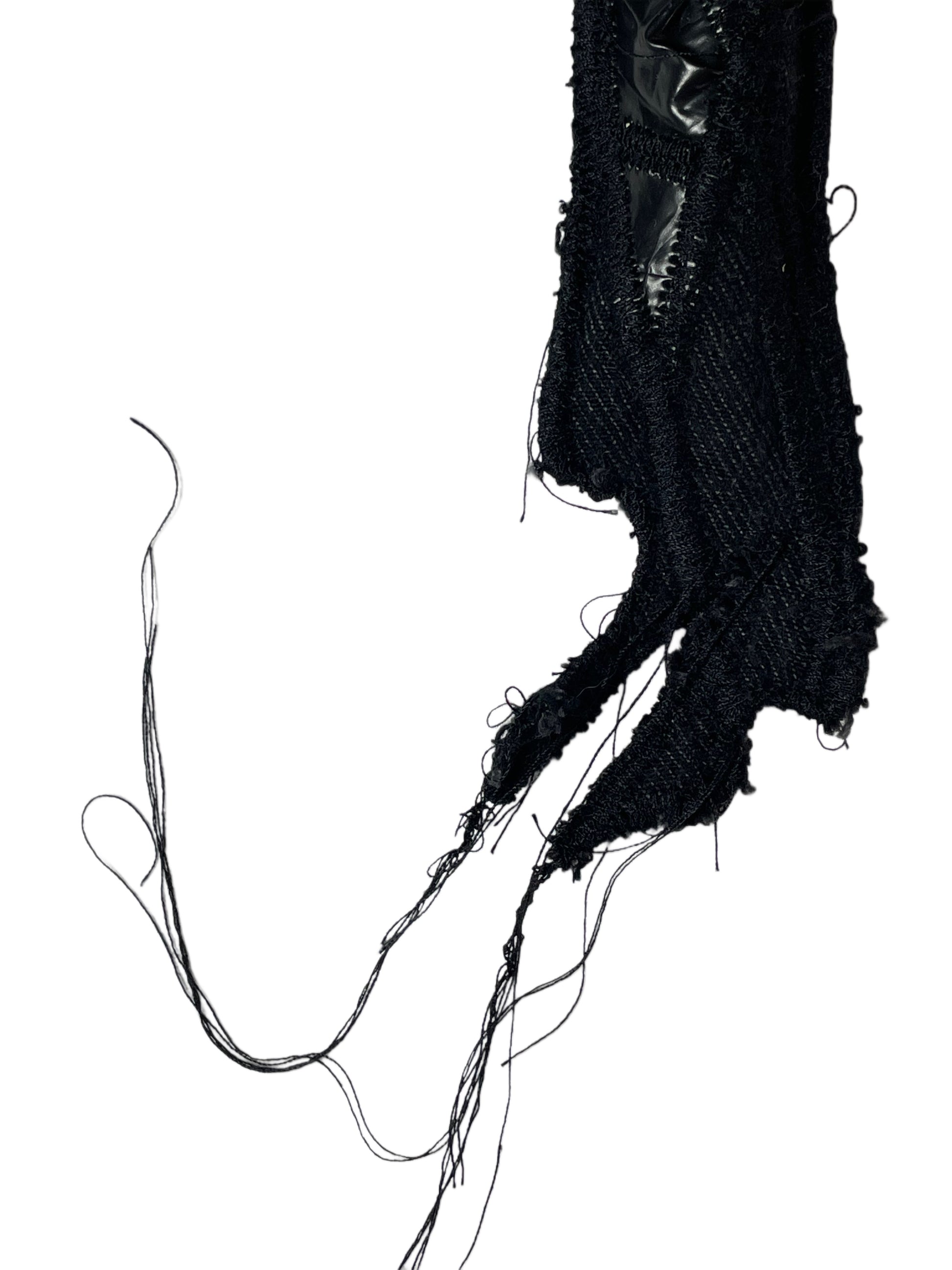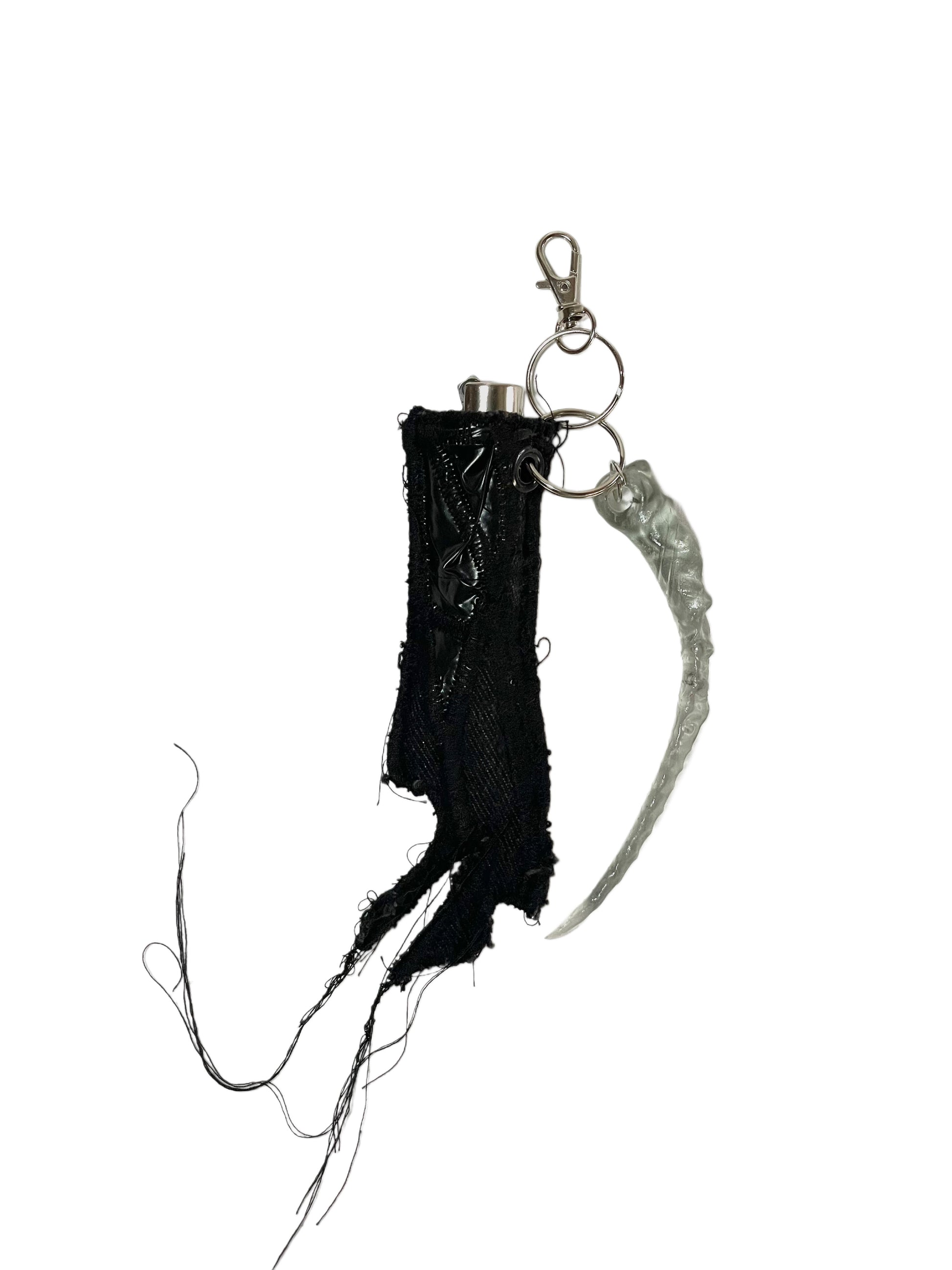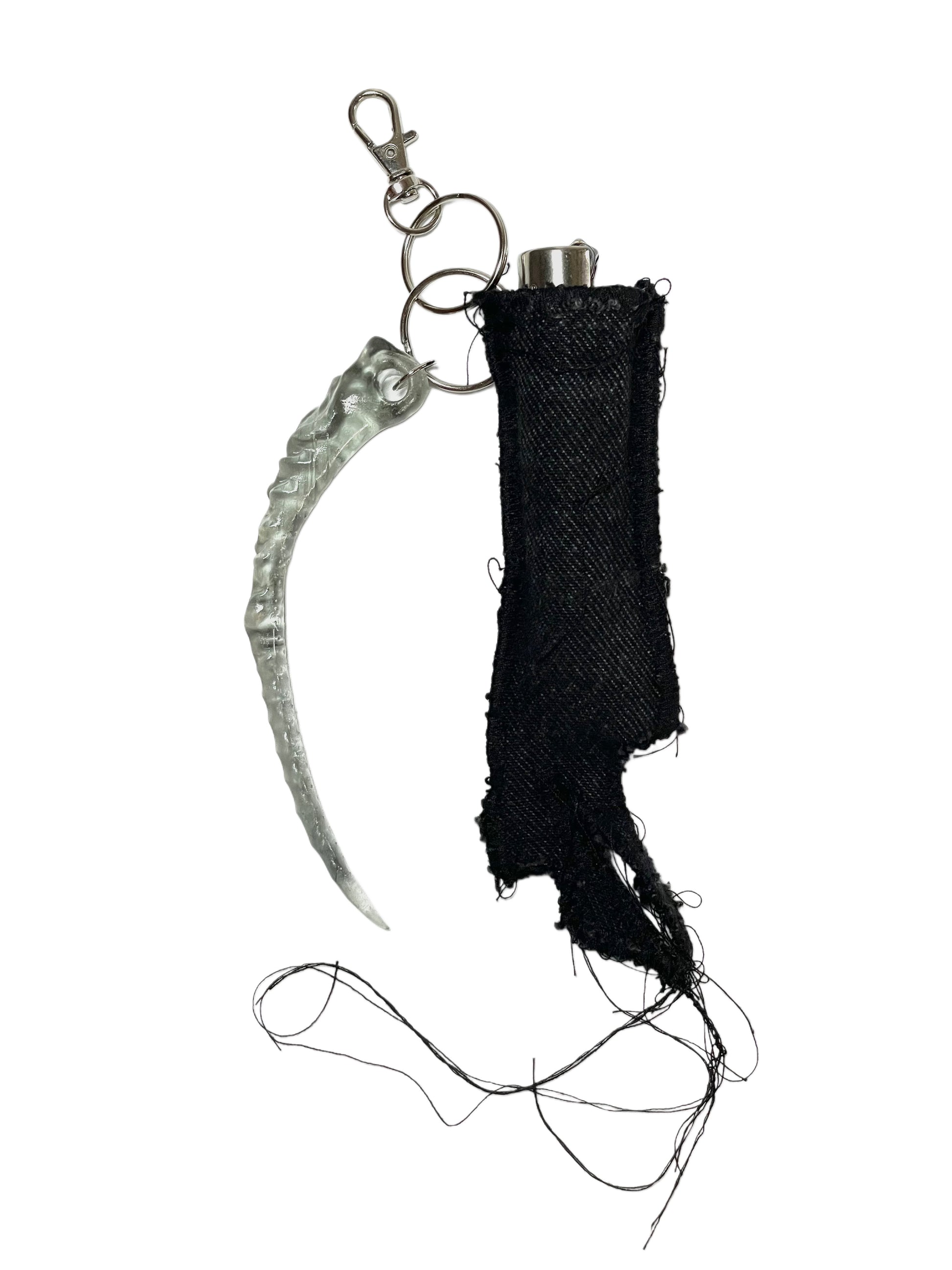 Black jeans lighter case with pvc and threads details featuring a transparent 3D-printed claw by 9thereal.
