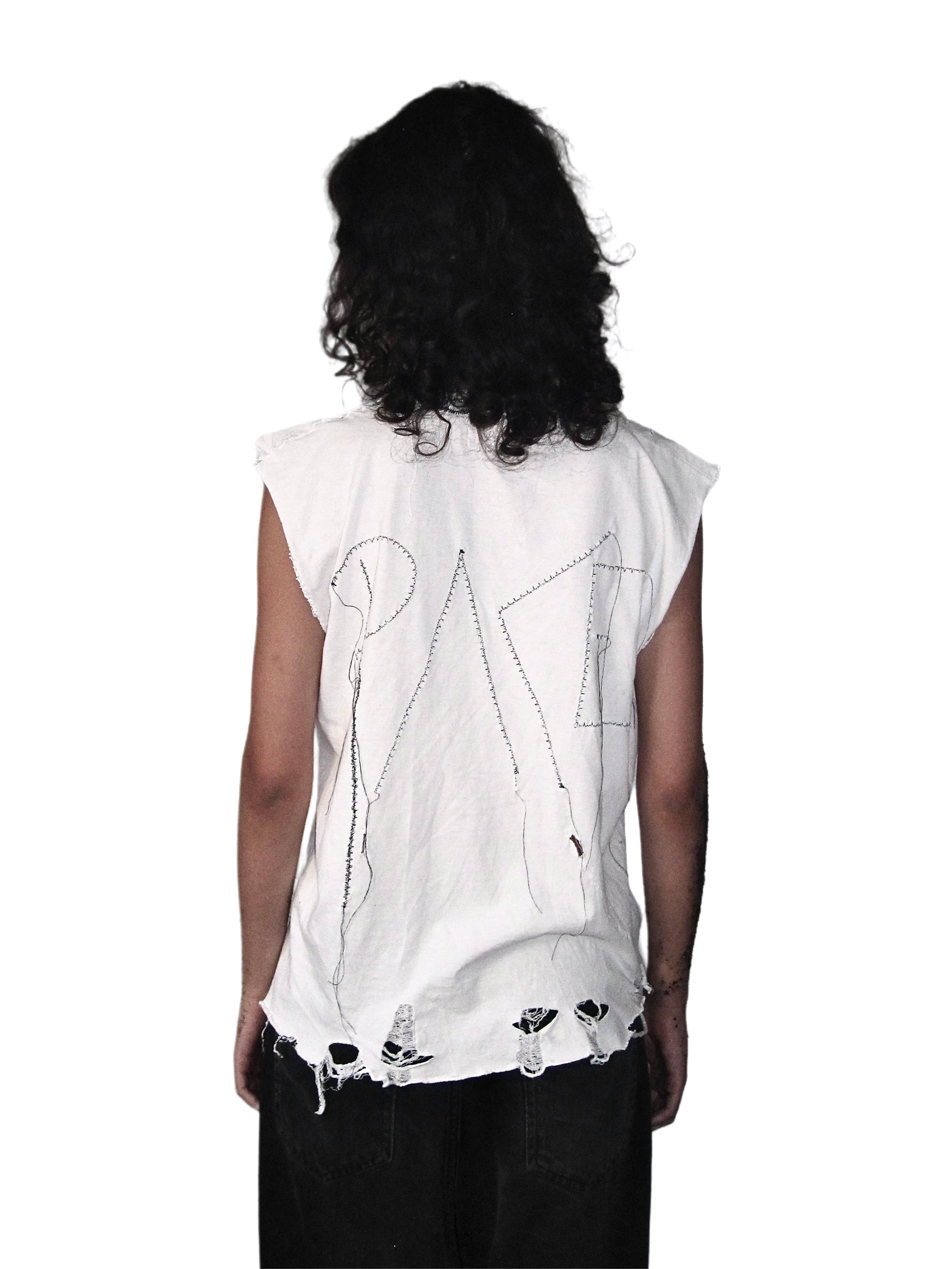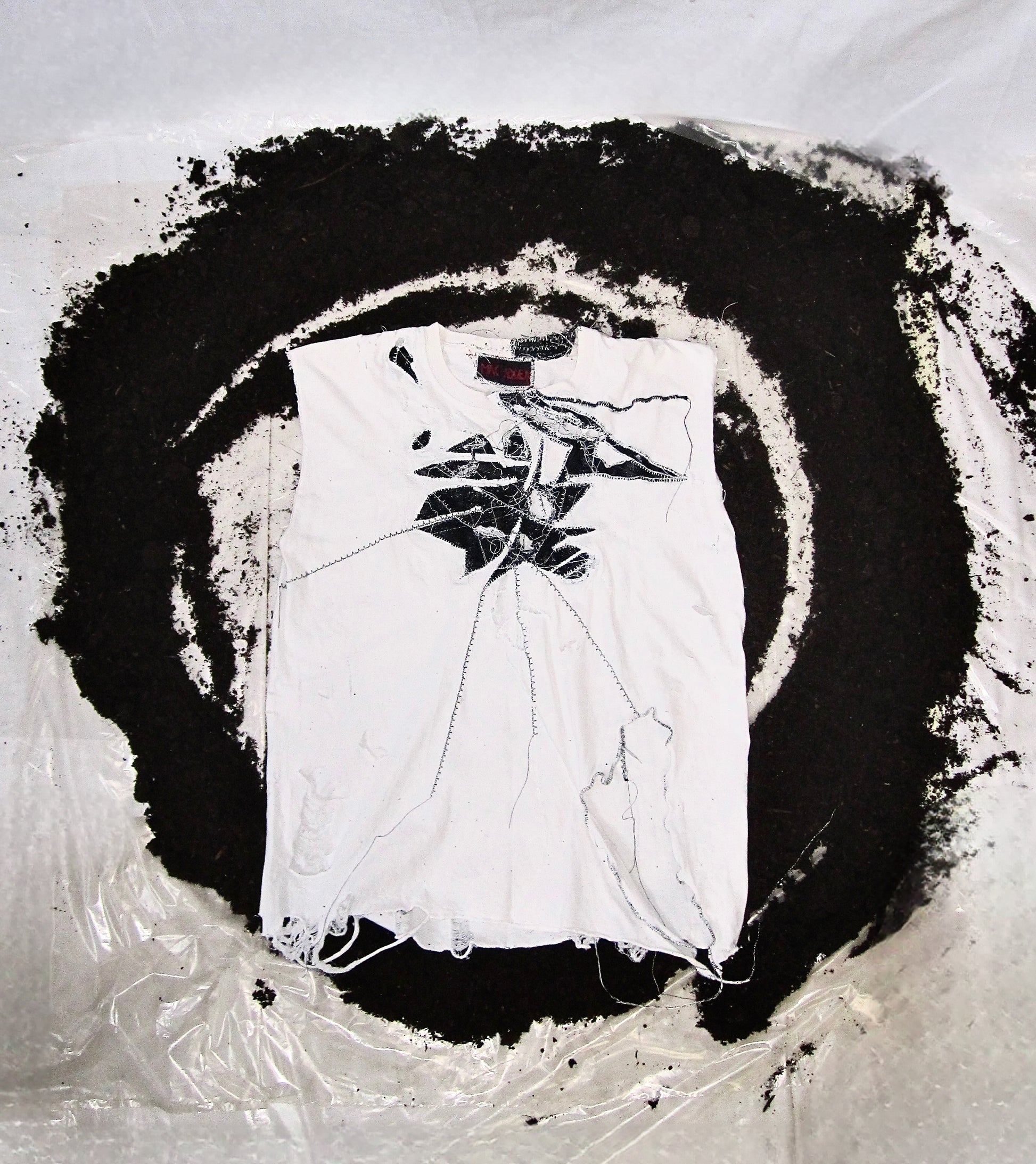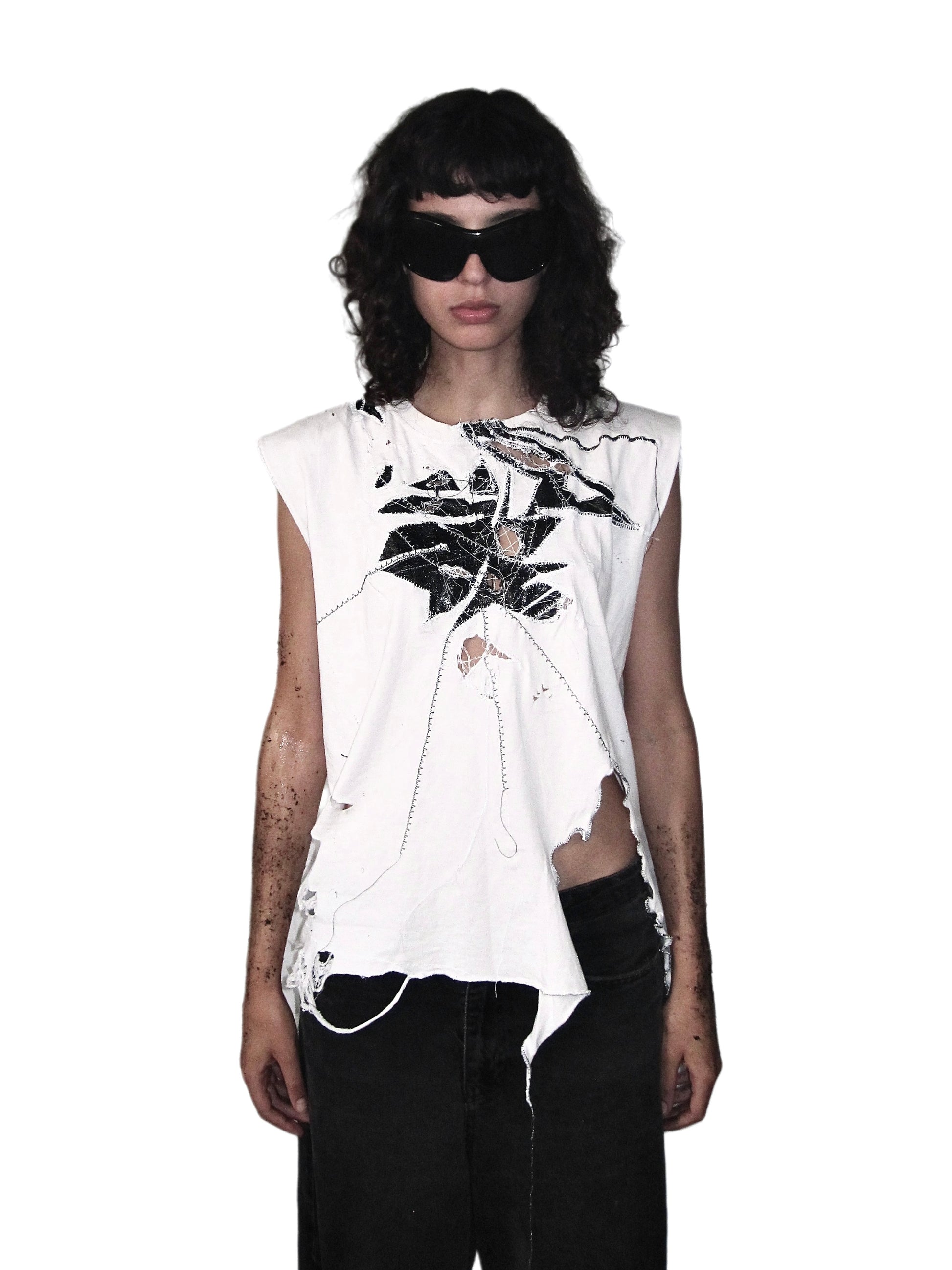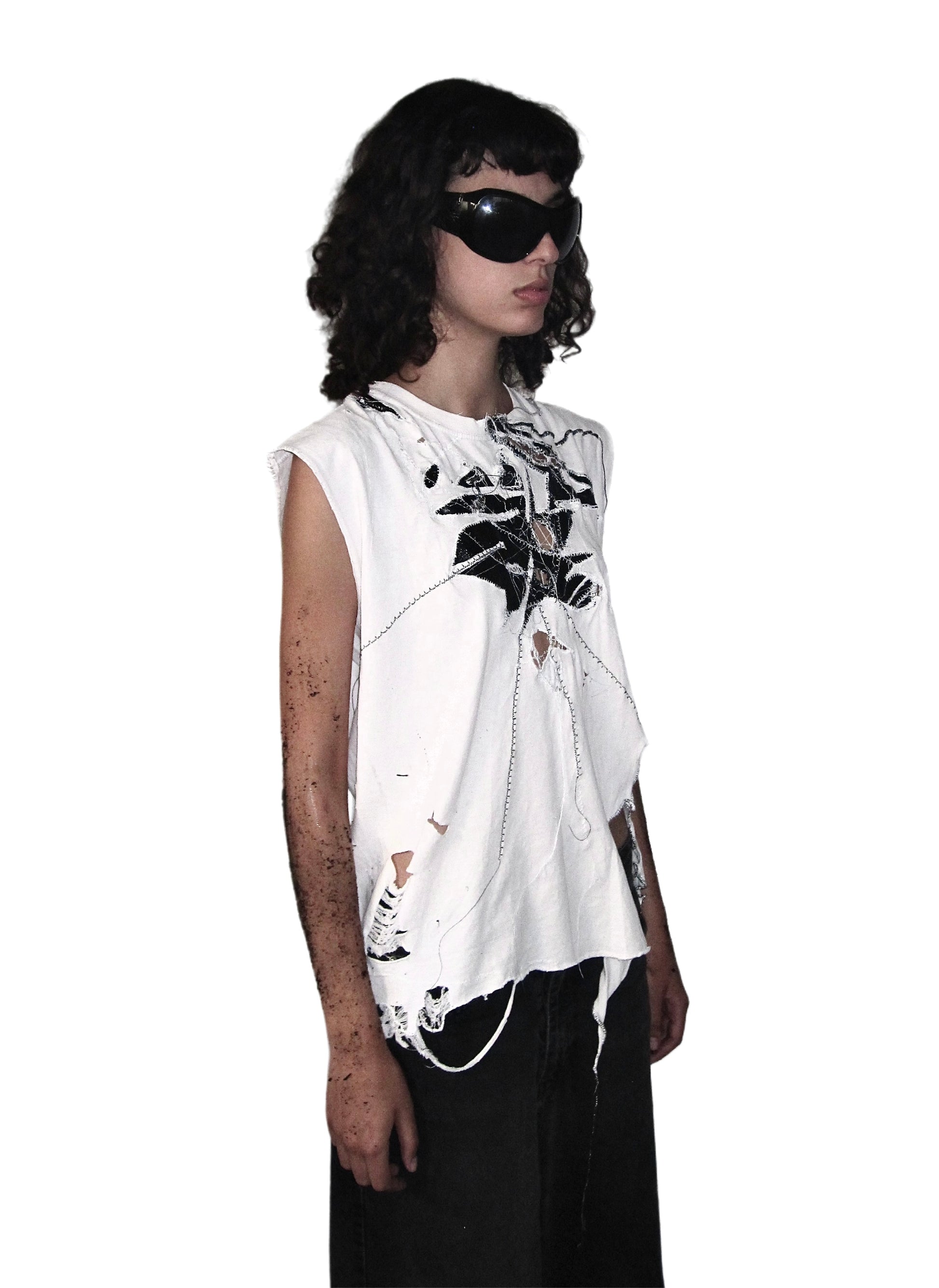 Asymmetrical distressed t-shirt featuring black details made of recycled PVC and stitches. Deconstructed cut and word pace on the back.